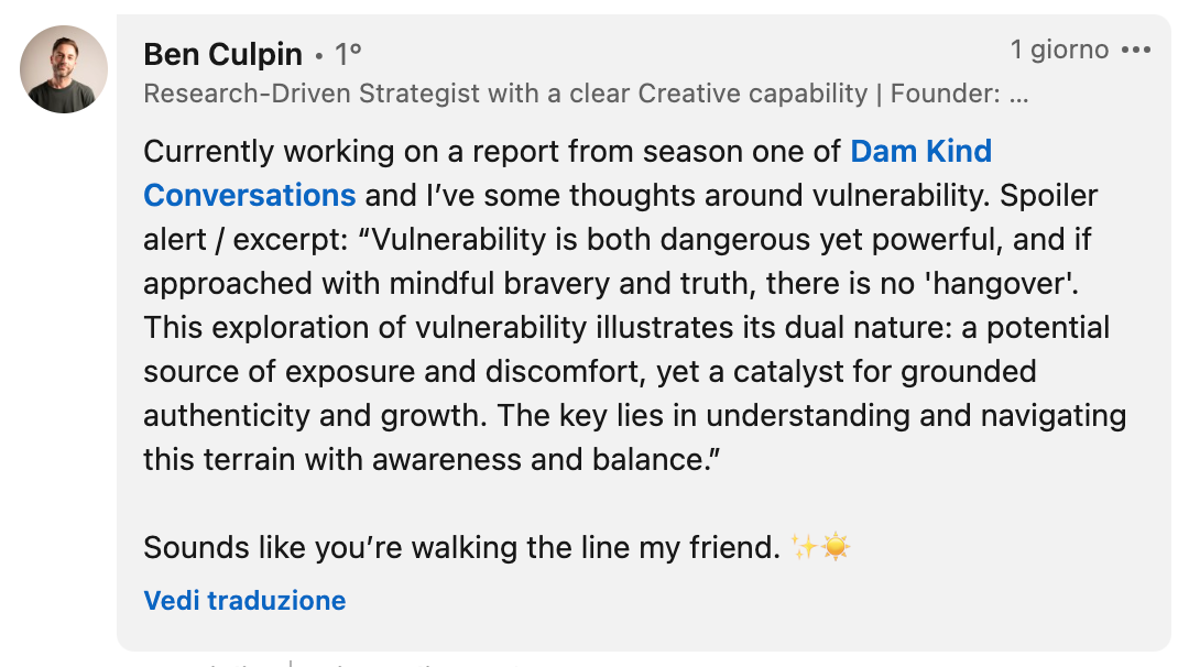 Sharing my vulnerability is also something that scares the heck out of me. Timidly promoting this upcoming post on Linkedin, I transformed the fear into a quest: Writing and publishing as means to transform vulnerability into strength? Ben Culpin, a researcher and strategist hanging in the Protein discord, puts it beautifully in the post's comments. Check his work and listen to Dam Kind Conversations.