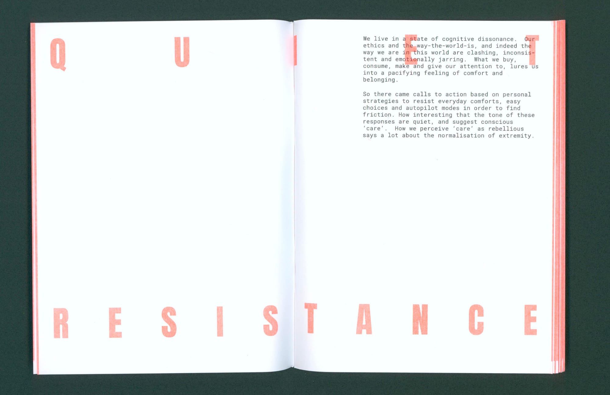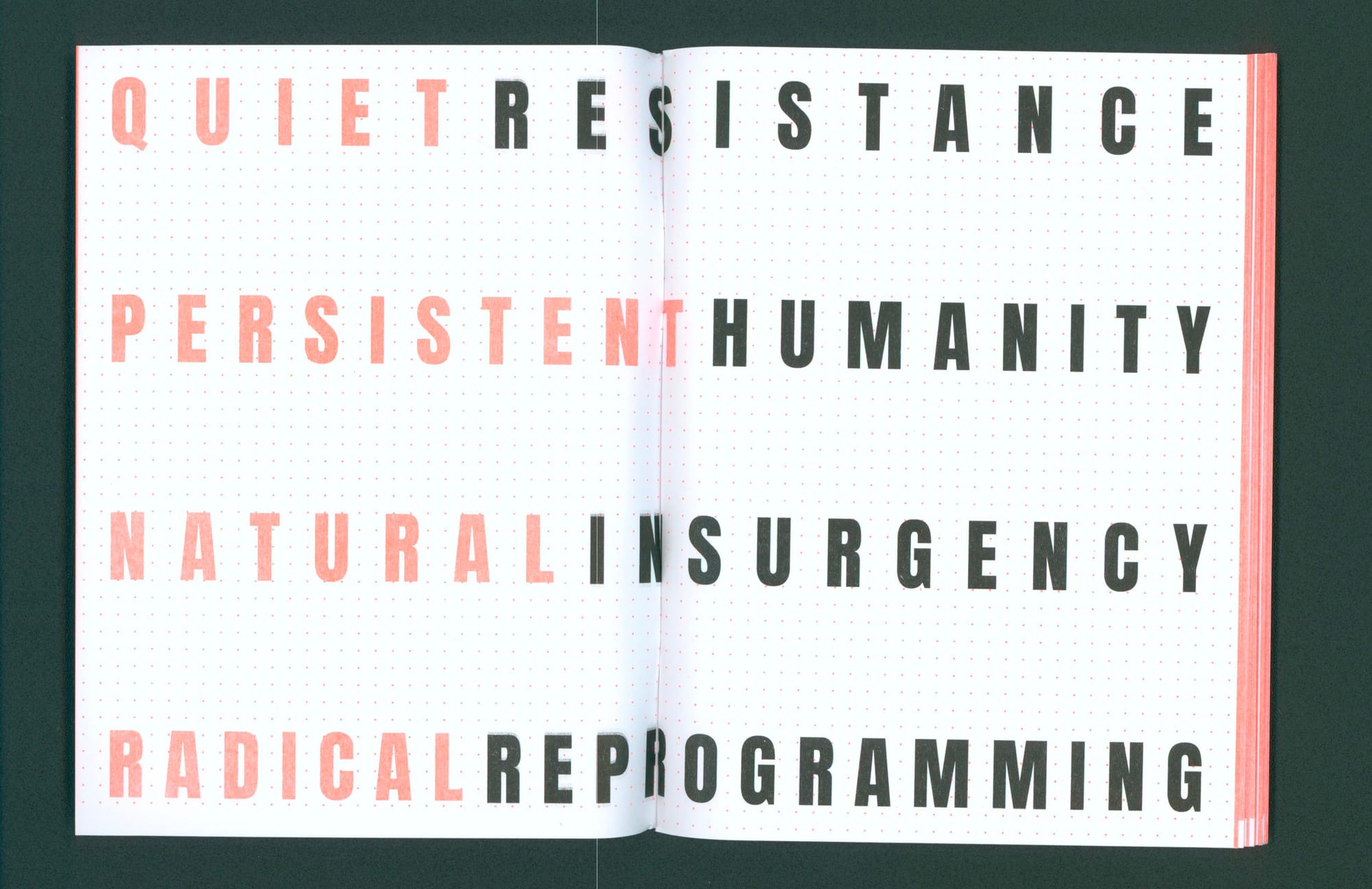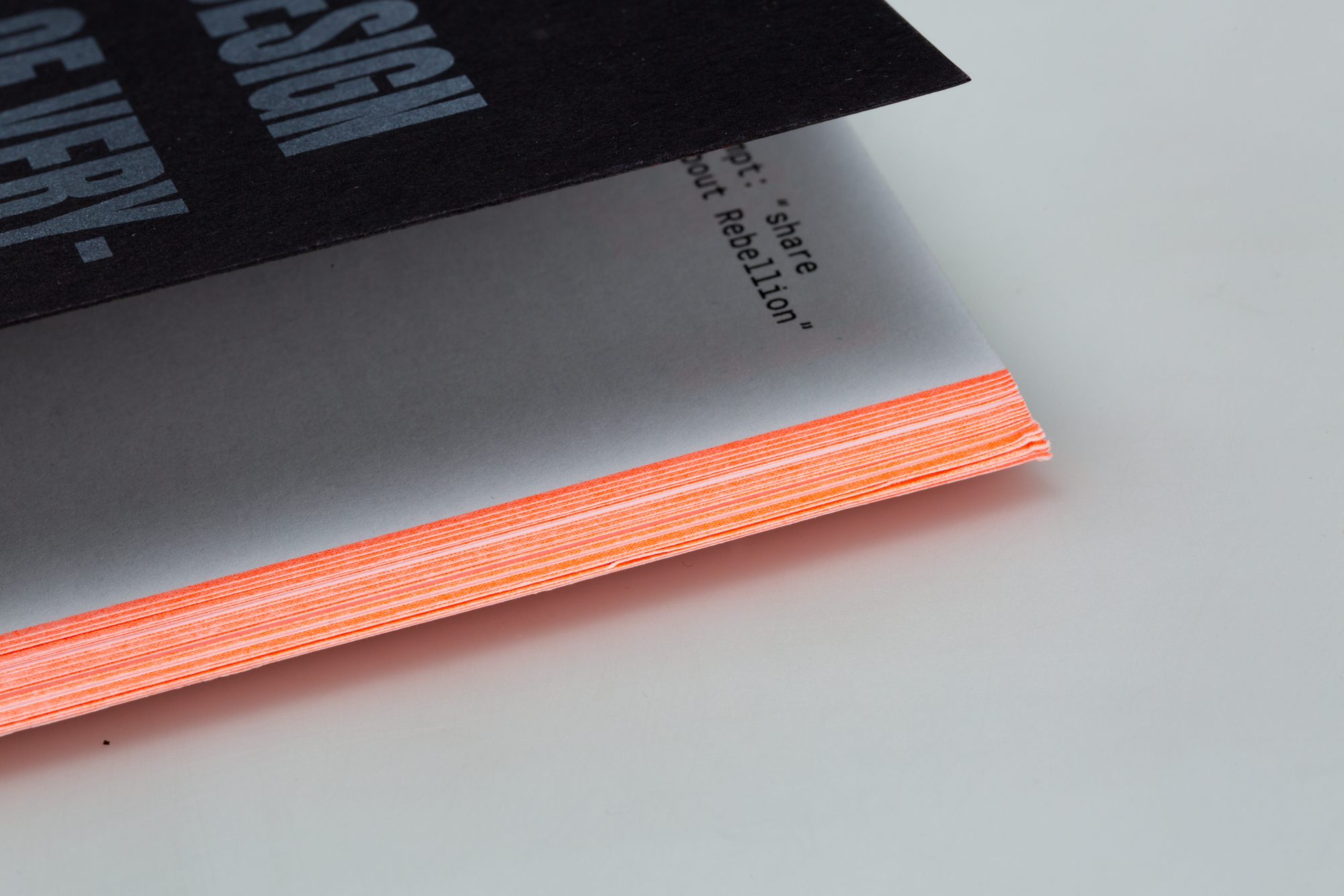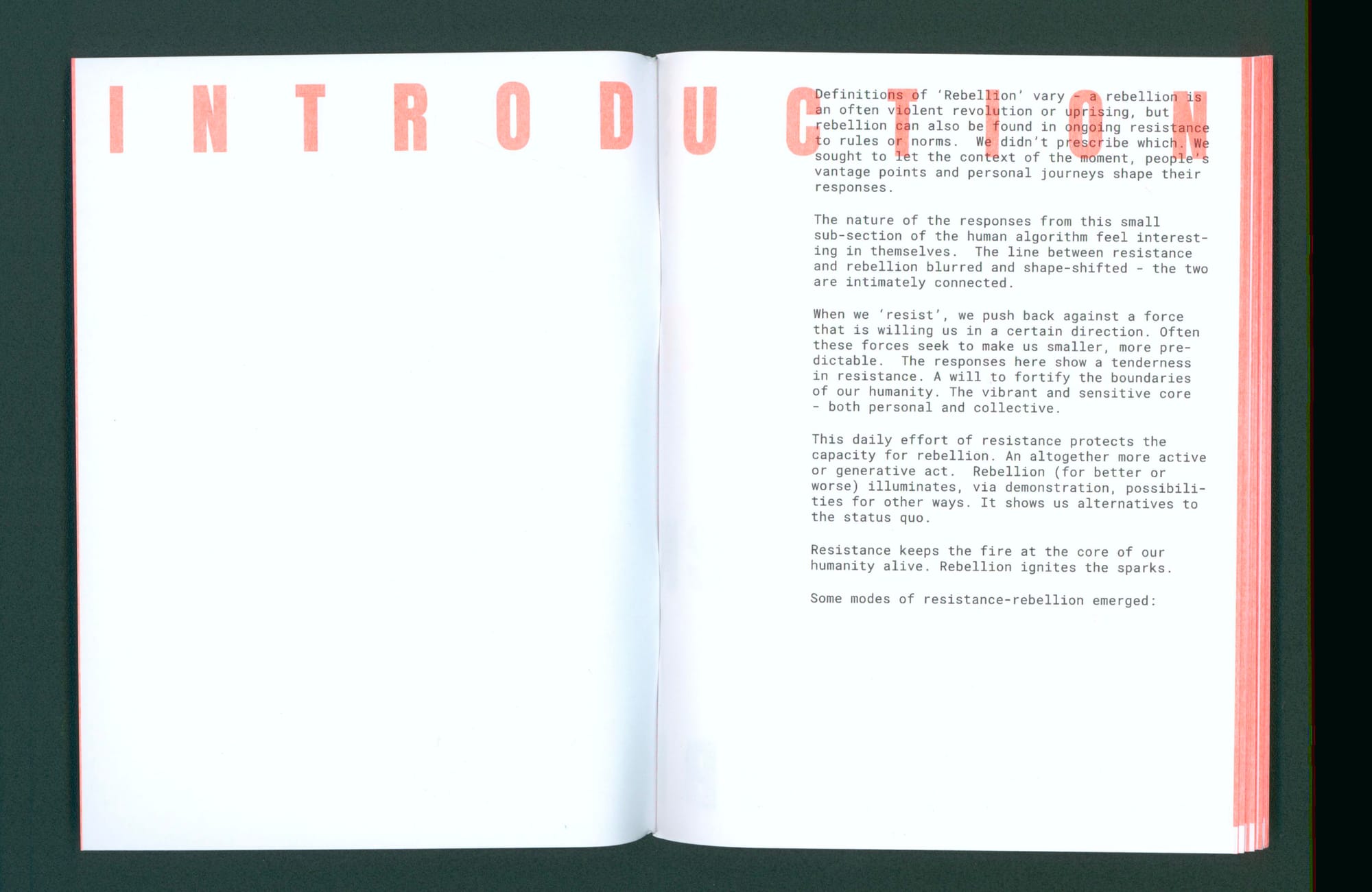 A prompt: #REBELLION sent out to a community. What came back was a range of responses. Inside every answer, new questions. Many rebellion topics have emerged, other did not. The design leaves space to breathe and invites annotations. Fifty copies, riso printed, hand folded and bound.