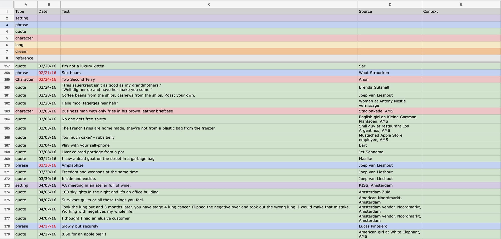 I really do enjoy organizing and archiving material on the computer, but once it’s nicely cataloged in the folder system, it’s damn easy to never look at it again. Still, I don’t know how I’d keep my head on if I didn’t use my research > design > process > print > press structure. One archive with no purpose other than the enjoyment of collecting and organizing is my ongoing Google Sheet of overheard & observed things (2011-present).